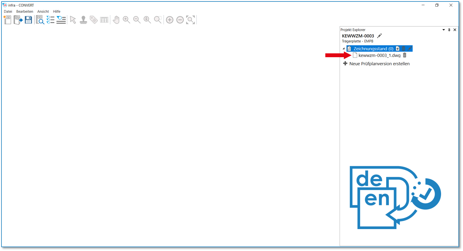 2 Zeichnungsblatt auswählen und hinzufügen Navigieren Sie zum Speicherort des Zeichnungsblattes und laden Sie dieses (Verzeichniseintrag doppelklicken oder Eintrag auswählen und auf Öffnen klicken). Die Zeichnung wird als Eintrag im Projektexplorer angezeigt: