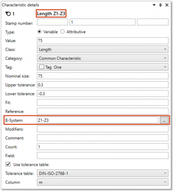 The essential geometrical elements (areas, planes and axes) are given identifiers (“Z1”, “Z2”, “Y1” etc.) This enables the reference geometries to be identified with greater certainty in the quality control process. The step measurement “75” is the distance between the front surface “Z1” and the section “Z3”. In the quality control plan this characteristic is shown as “length Z1–Z3”.