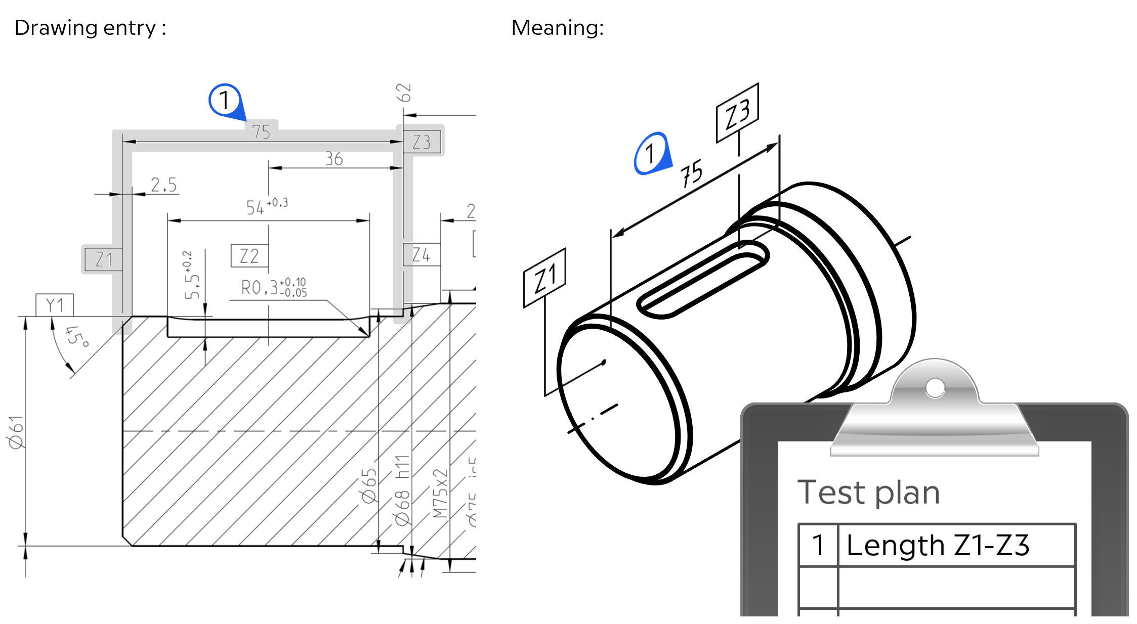 The essential geometrical elements (areas, planes and axes) are given identifiers (“Z1”, “Z2”, “Y1” etc.) This enables the reference geometries to be identified with greater certainty in the quality control process. The step measurement “75” is the distance between the front surface “Z1” and the section “Z3”. In the quality control plan this characteristic is shown as “length Z1–Z3”.