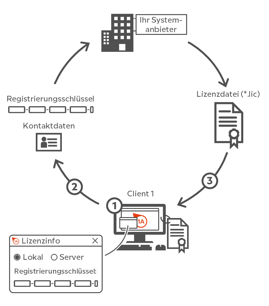 Den für diese Installation erzeugten, individuellen Registrierungsschlüssel senden Sie zusammen mit Ihren Kontaktdaten per E-Mail (A) an den Service der ELIAS GmbH.