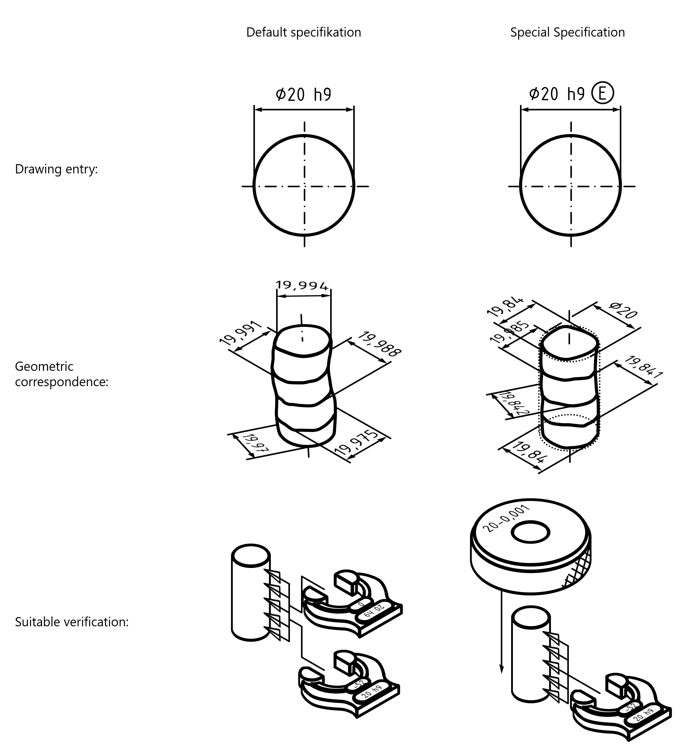 The deviation from the default setting can be identified using suitable specification modifiers (and/or abbreviations). In this way a “special specification operator” is obtained. In this example, the “E in circle” modifier symbol sets the envelope condition. The envelope condition requires that the evaluated geometry lies in an enveloping cylinder 20 mm in diameter and that all two-point sizes are greater than or equal to 19.948 mm. A suitable verification would be to test using a ring gauge or to carry out a no-go test using a go/no go gauge.